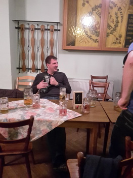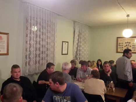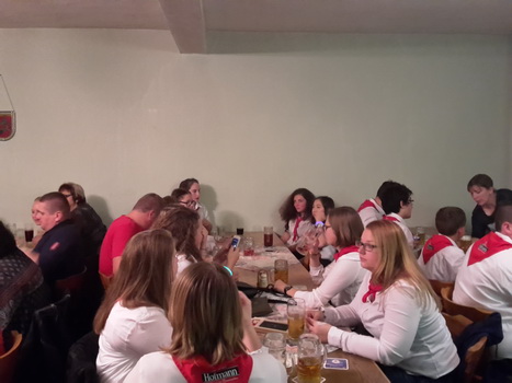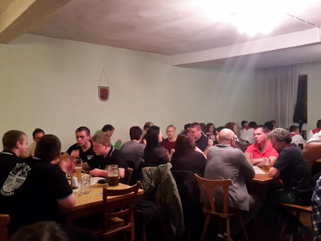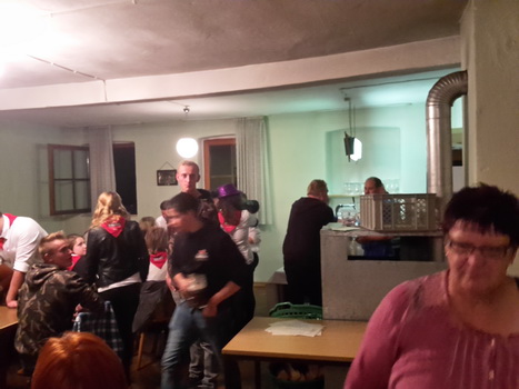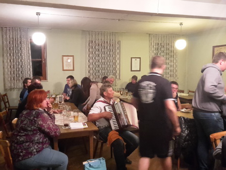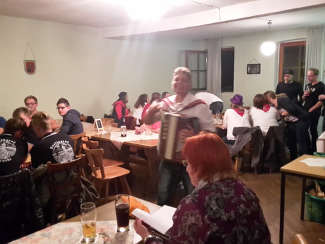 Ruckzuck wor der Saal heier wieder voll. A Bier, a Musi, Holadrio! Do gfällts uns. Der Kerwa-Veteran hängt a nu recht an der Liesl.