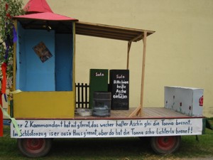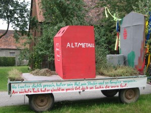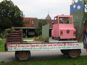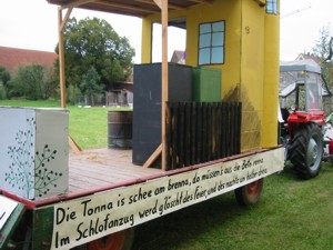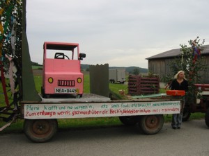 Am Kerwasunndoch werd frie um achta ugfangt, di Bulldäg und di Wägn für'n Umzug zu schmückn. Do wern di buntn Bänder an die Bulldäg klebt, Birken wern überoll hiegsteckt und wos halt so alles zu an scheena Umzug derzukerrt. Of jeden Fall gibt's jeds Johr nu a Haufn zu do und mir wern grod immer bis zum Umzug ferti.