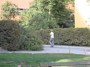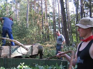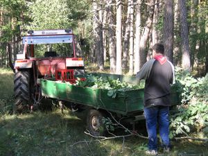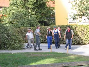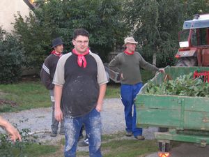 Am Kerwafreidoch wern namidoch die Birken zum Schmückn vom Sängerwogn und vo di Bulldog gholt. Die Achenblätter für'n Kranz am Kerwabam nemmer natirli a glei mit. Und nit zu vergessn, a zwa Birkn für's Griecherdenkmol..